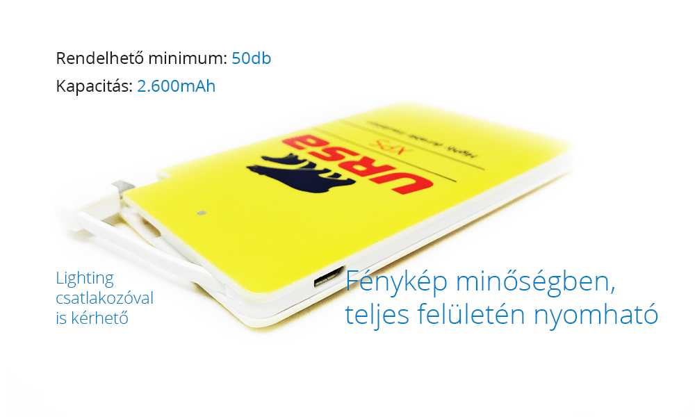 Kérje árajánlatunkat!Miért érdemes velünk dolgozni? 10 éve állunk partnereink rendelkezésére, és a folyamatos fejlesztéseknek, gyártási szabadalmaknak, a saját gyártói bázisnak és a minőségellenőrzésnek köszönhetően ma már piacvezetőek vagyunk. Minden általunk gyártott egyedi powerbank termék minőségi darab, "A+" kategóriás akkumulátorral, garantált kapacitással és hosszú élettartammal. Emellett számos ingyenes szolgáltatást nyújtunk partnereinek, de egyéb előnye is van annak, ha nálunk rendeli meg egyedi powerbank termékeit.